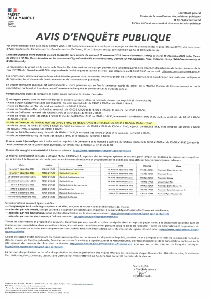 Enquête publique sur le projet de plan de prévention des risques littoraux (PPRL) des communes de :