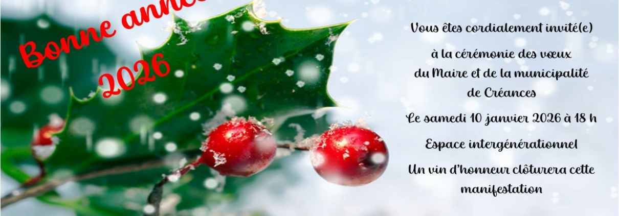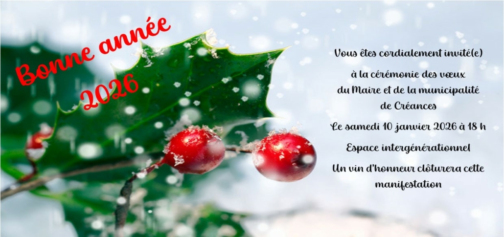 Actualités https://ville-creances.fr/wp-content/uploads/2026/01/Voeux-2026-1.jpg 584 1240 Lucie LEMOIGNE https://ville-creances.fr/wp-content/uploads/2016/11/logo.jpg Lucie LEMOIGNE2026-01-06 15:59:552026-01-06 15:59:55